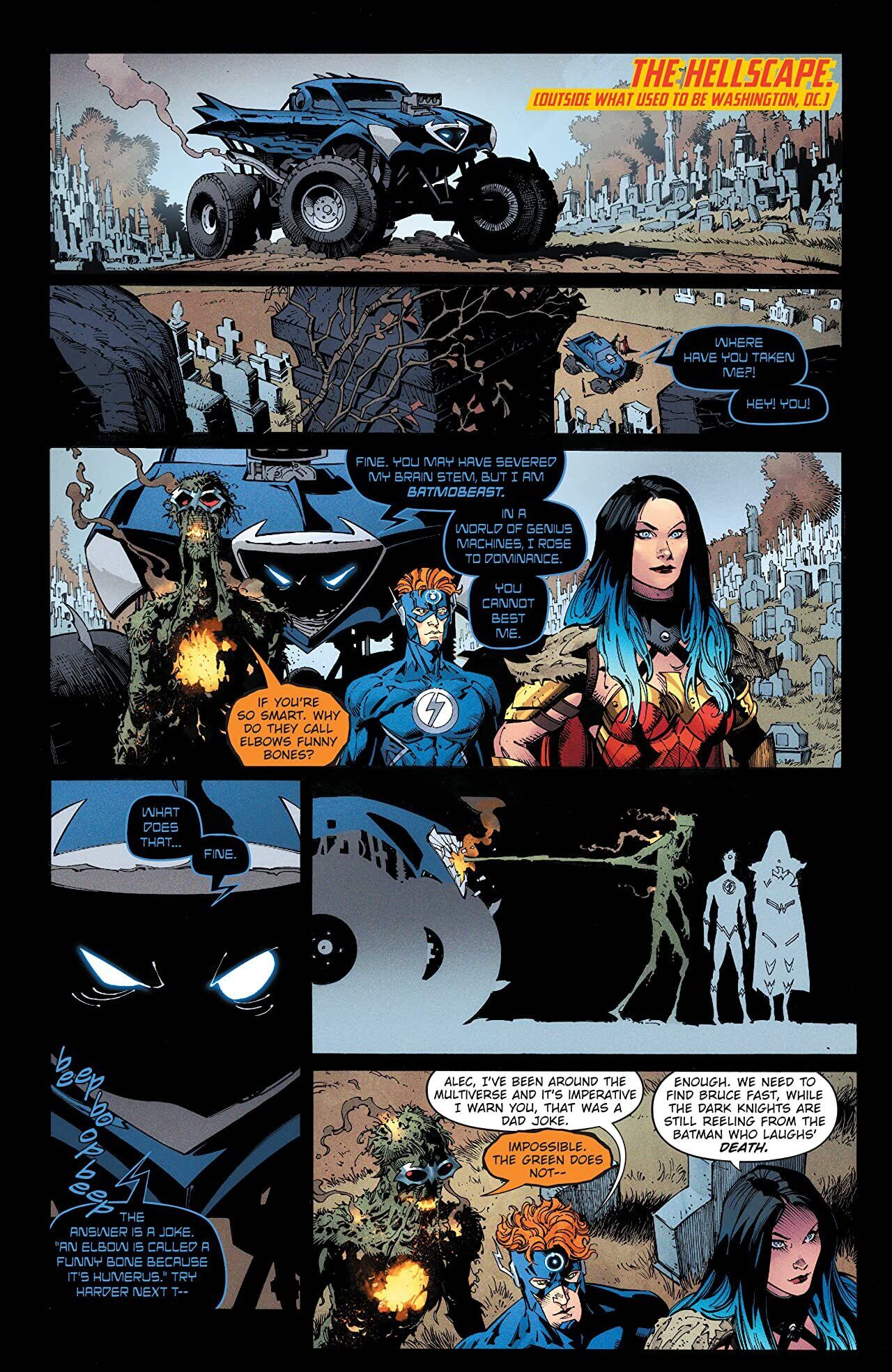 Get ready to scream! Wonder Woman roars across the horrifying Dark Multiverse landscape in the world’s most demented monster truck, with Swamp Thing riding shotgun! The two arrive at the ghoulish cemetery base of Batman and his army of zombies, but can the former friends stand each other long enough to form a plan and take back the planet? Plus, what’s Lobo doing in space?