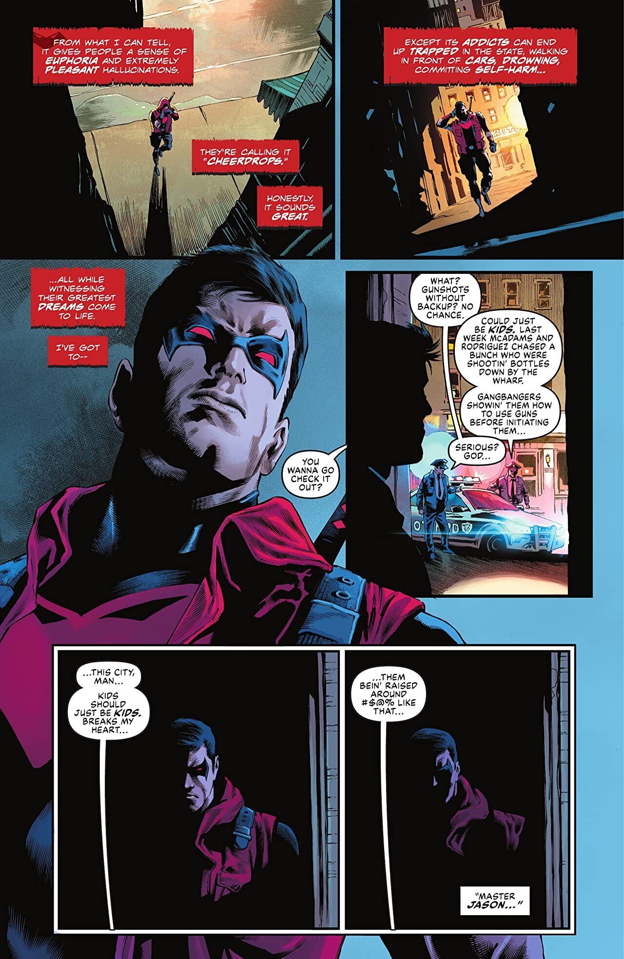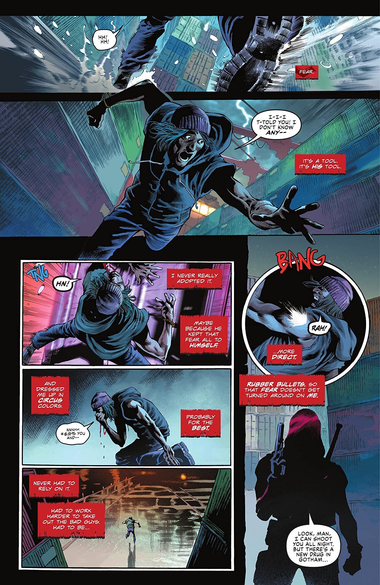 Then, in chapter two of Matthew Rosenberg and Ryan Benjamin’s senses-shattering tale, Cole Cash earns his pay as personal bodyguard to billionaire Lucius Fox, but what led him to Gotham in the first place? How does the mysterious HALO Corporation play into it all? And which Bat-Family character does he have an unfortunate meeting with in this chapter?