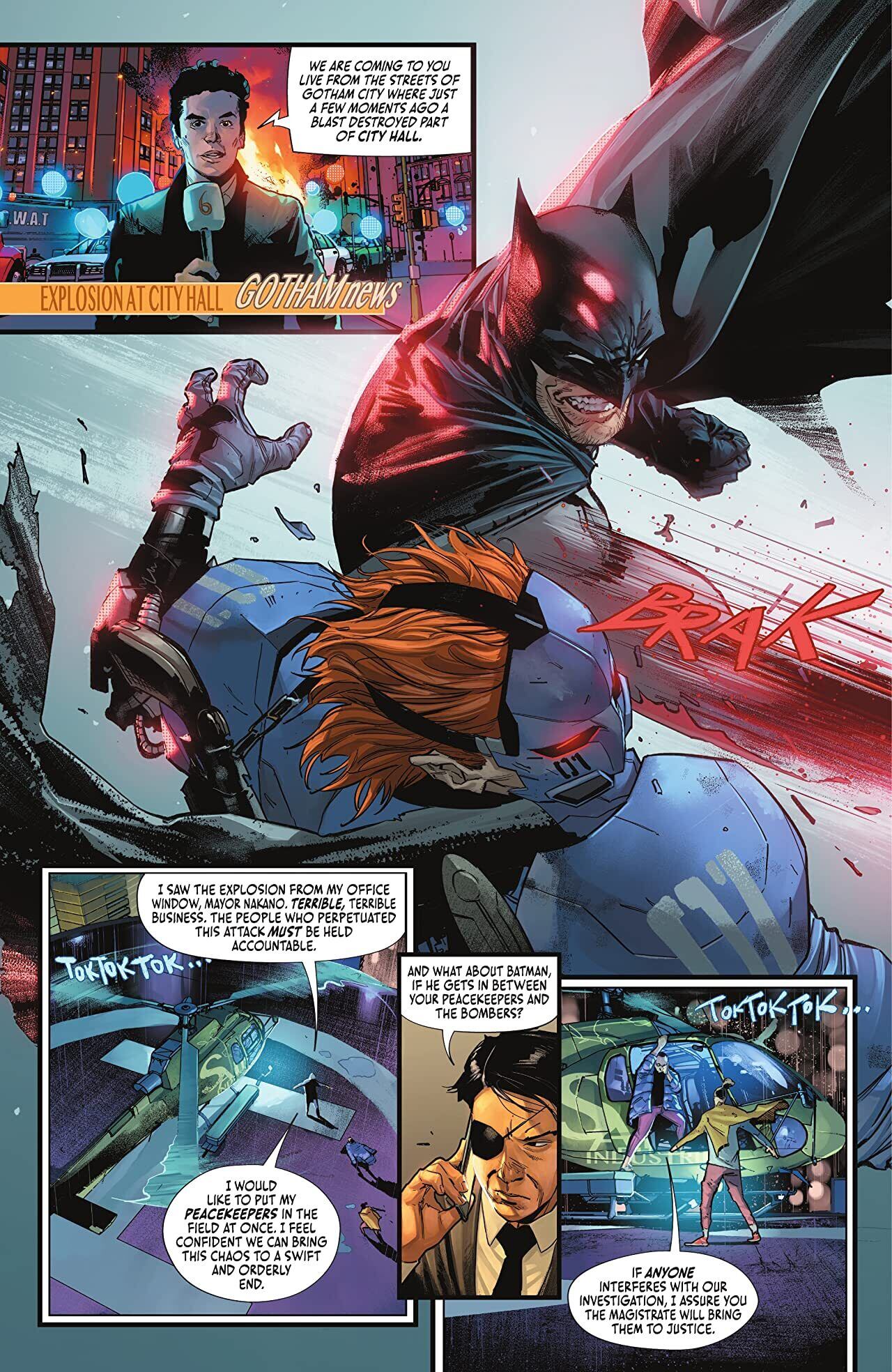 Main: Batman’s bloody, no-holds-barred fight with Magistrate enforcer Peacekeeper-01 rages on in epic fashion! Simon Saint’s master plan comes to fruition as his Magistrate program makes its move on Gotham City, and things are about to heat up! (Not in a good way!)