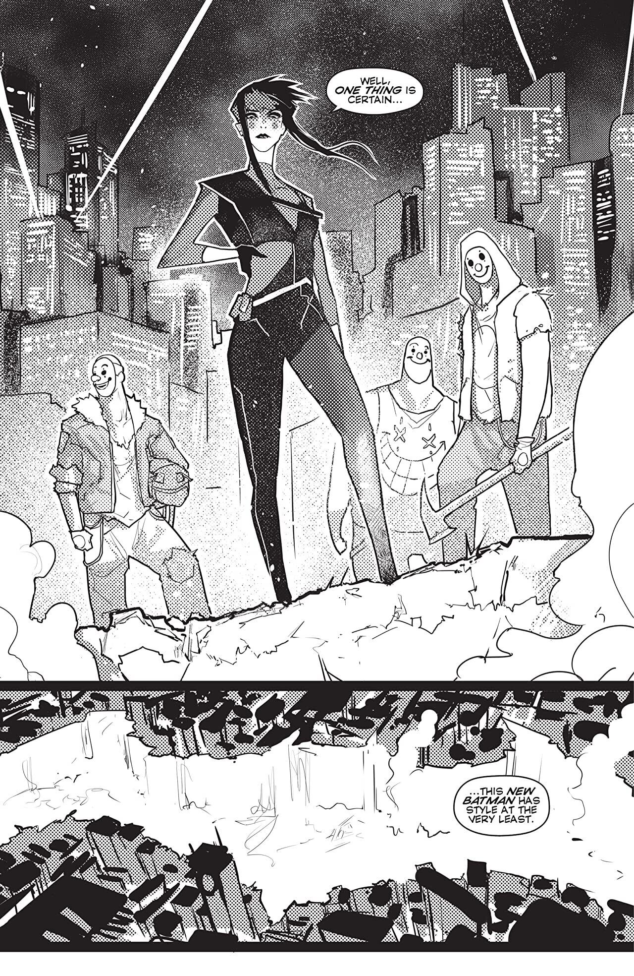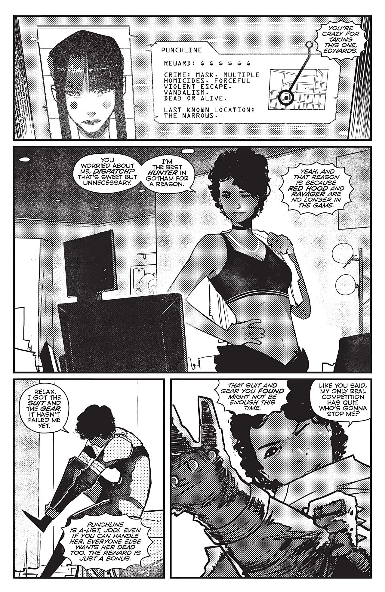 “Hunt the Batman” continues as Punchline prowls Gotham searching for the one thing she needs before leaving the city forever! The only person standing in her way is a revenge-fueled Harley Quinn! And just when things couldn’t get any worse, the brand-new hero Hunter Panic comes for them both!