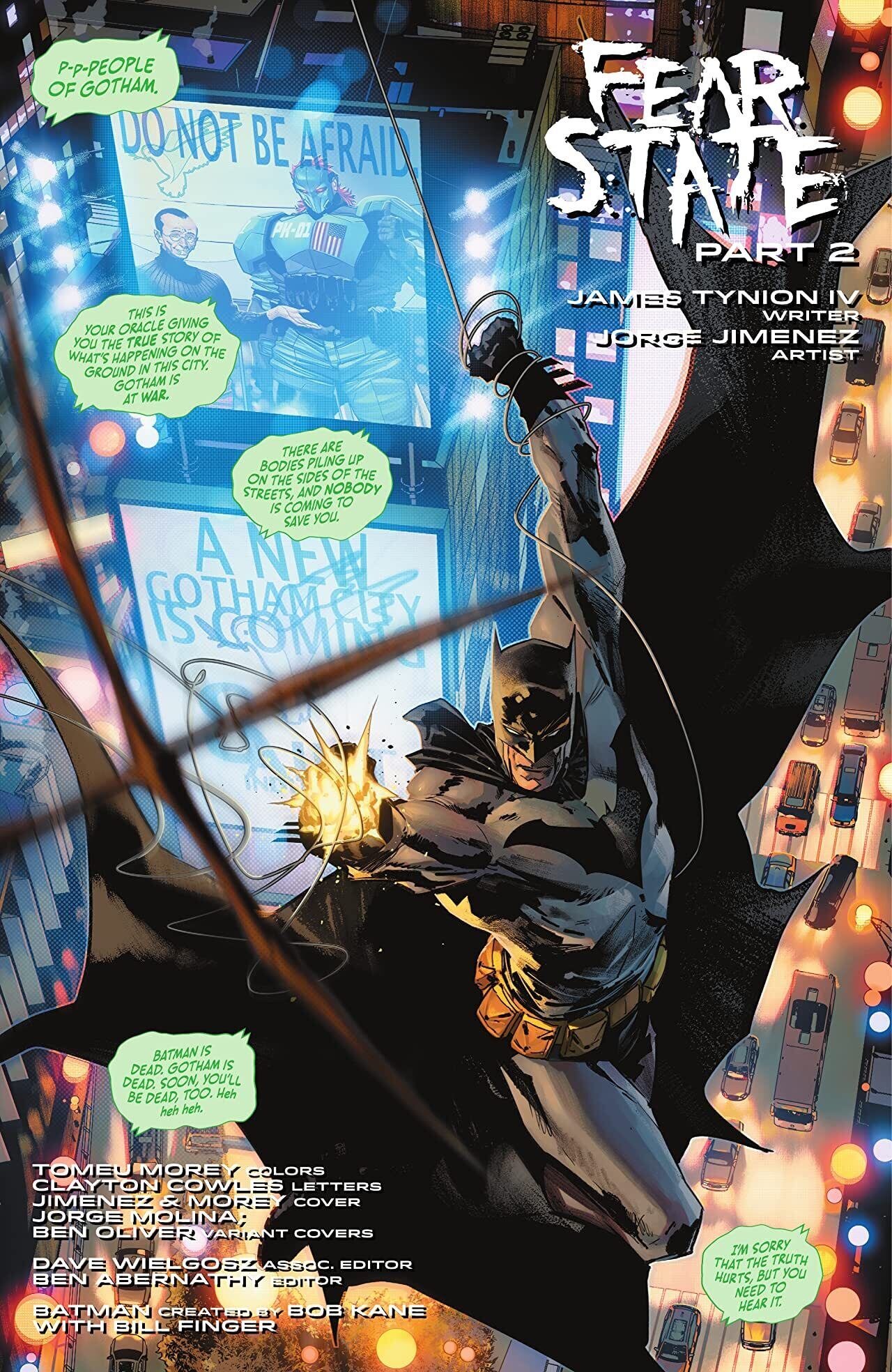 Ghost-Maker reveals a dark revelation about his past connection to Jonathan Crane while Batman puts together the pieces of Scarecrow’s master plan. Using the Unsanity Collective’s technology, the villain plans to detonate a “Fear Bomb” in Gotham City! Backup: Clownhunter has been dosed by the Scarecrow with a deadly fear toxin and is now traveling through his greatest nightmare of Gotham City. Will the Clownhunter center himself and strike back at Scarecrow? Or will he succumb to all his worst fears?!