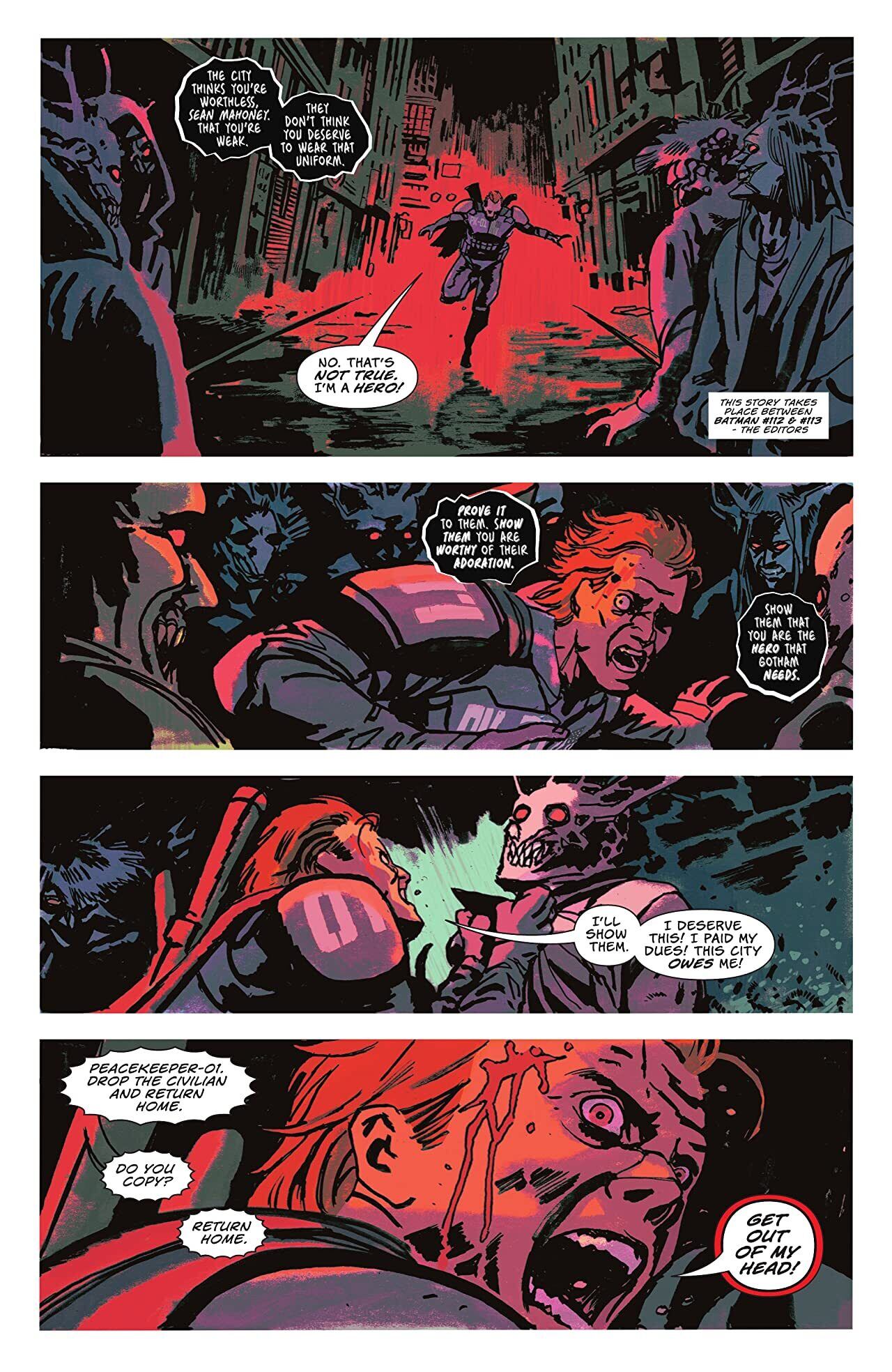 Picking up after the events of Fear State: Alpha, follow Sean Mahoney, a.k.a. Peacekeeper-01, in the wake of his exposure to highly potent Fear Toxin at the hands of the Scarecrow! Now, dosed with terror and facing a lifetime of fear and insecurity, Mahoney has found himself frantically reflecting on his past as a GCPD officer, and then as a prison guard at Arkham Asylum-all while desperately attempting to keep his mind from fracturing. Will Peacekeeper-01 give into fear…or become terror incarnate?