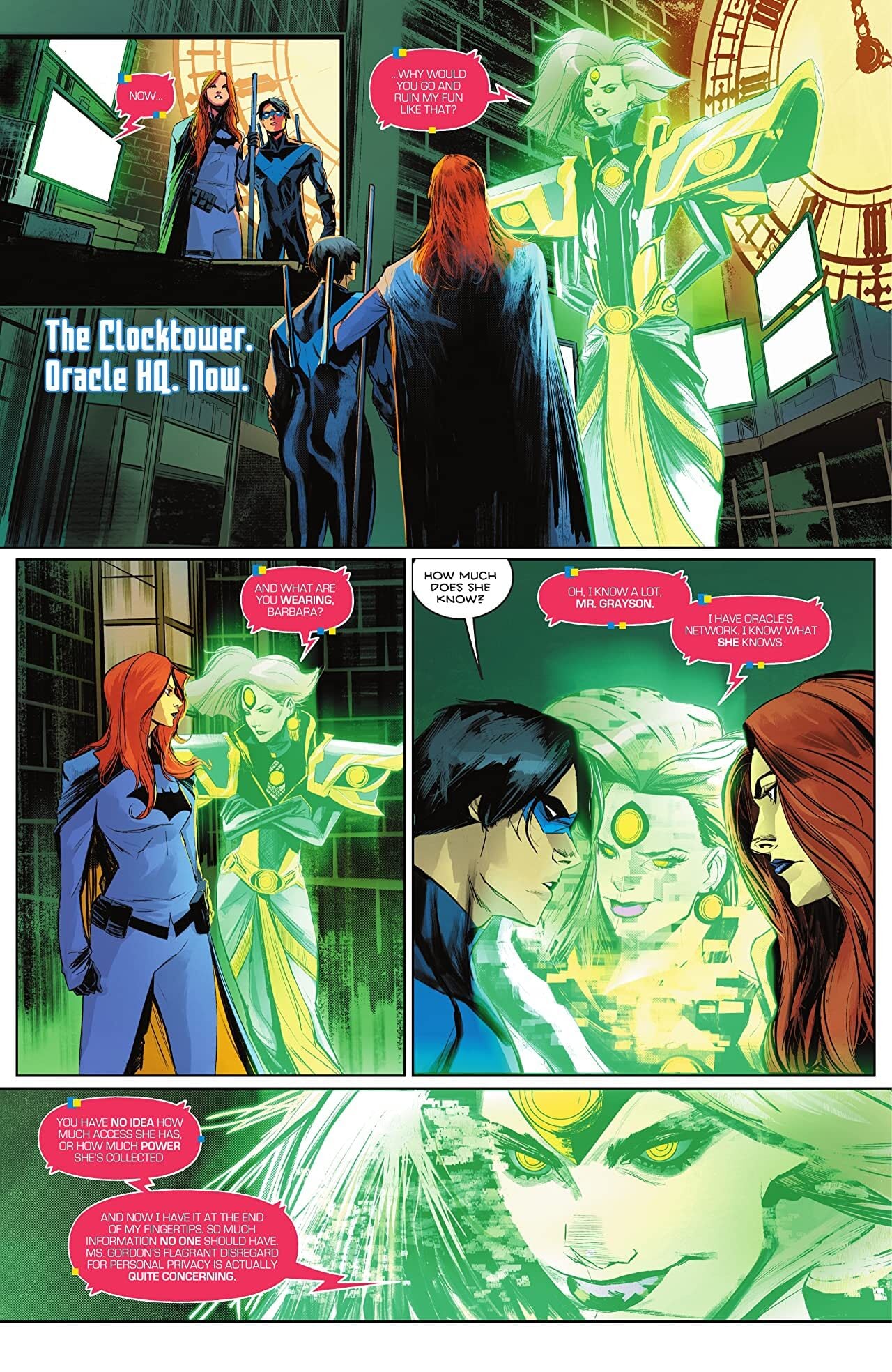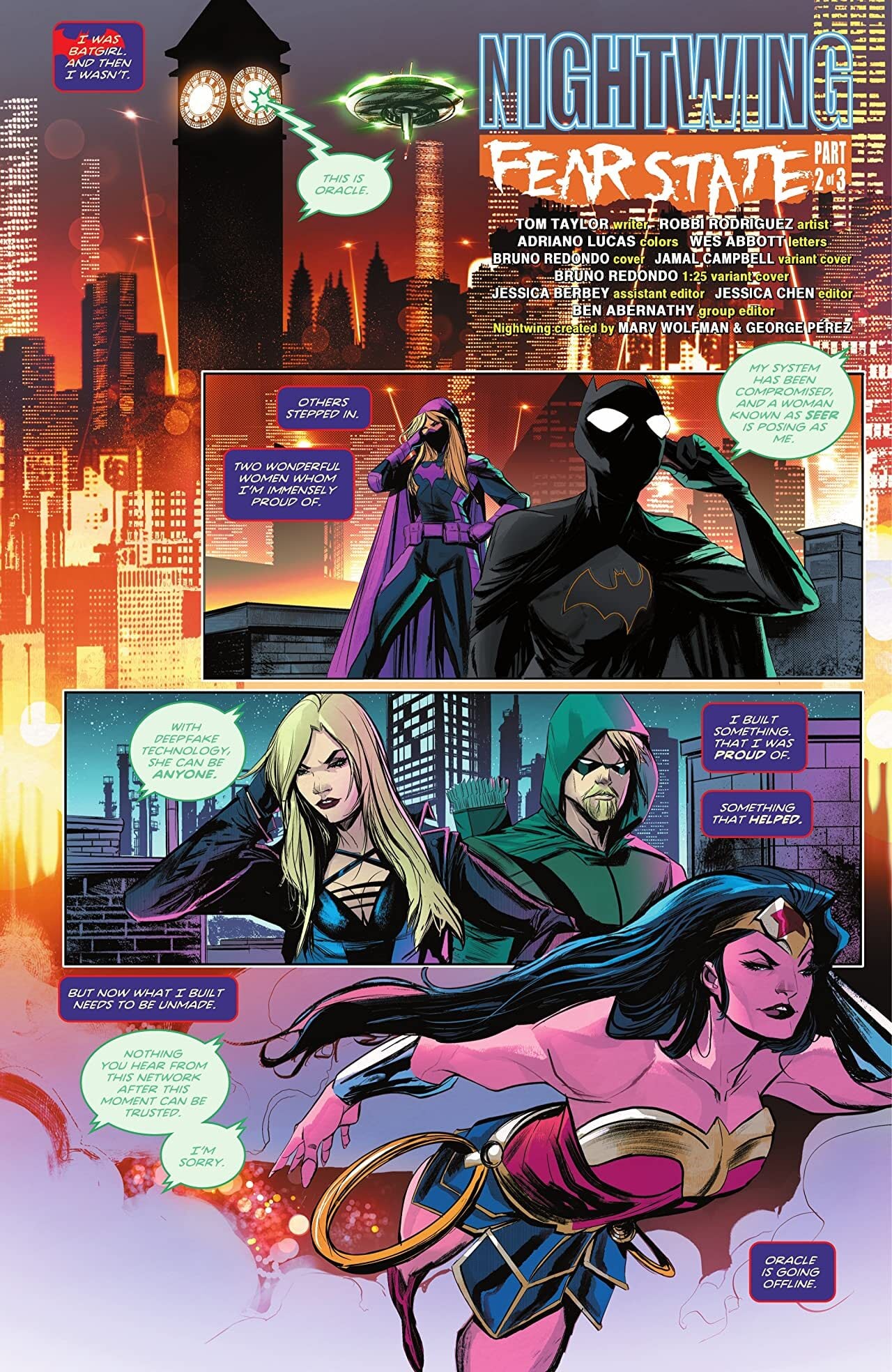 Babs takes the Anti-Oracle attack on her Oracle Network personally, and she suits up as Batgirl, accompanying Nightwing and Tim Drake to track down who is responsible. But with fear consuming the streets of Gotham, Batgirl and Nightwing accidentally get hit with something that reveals their deepest fears…and it involves each other.