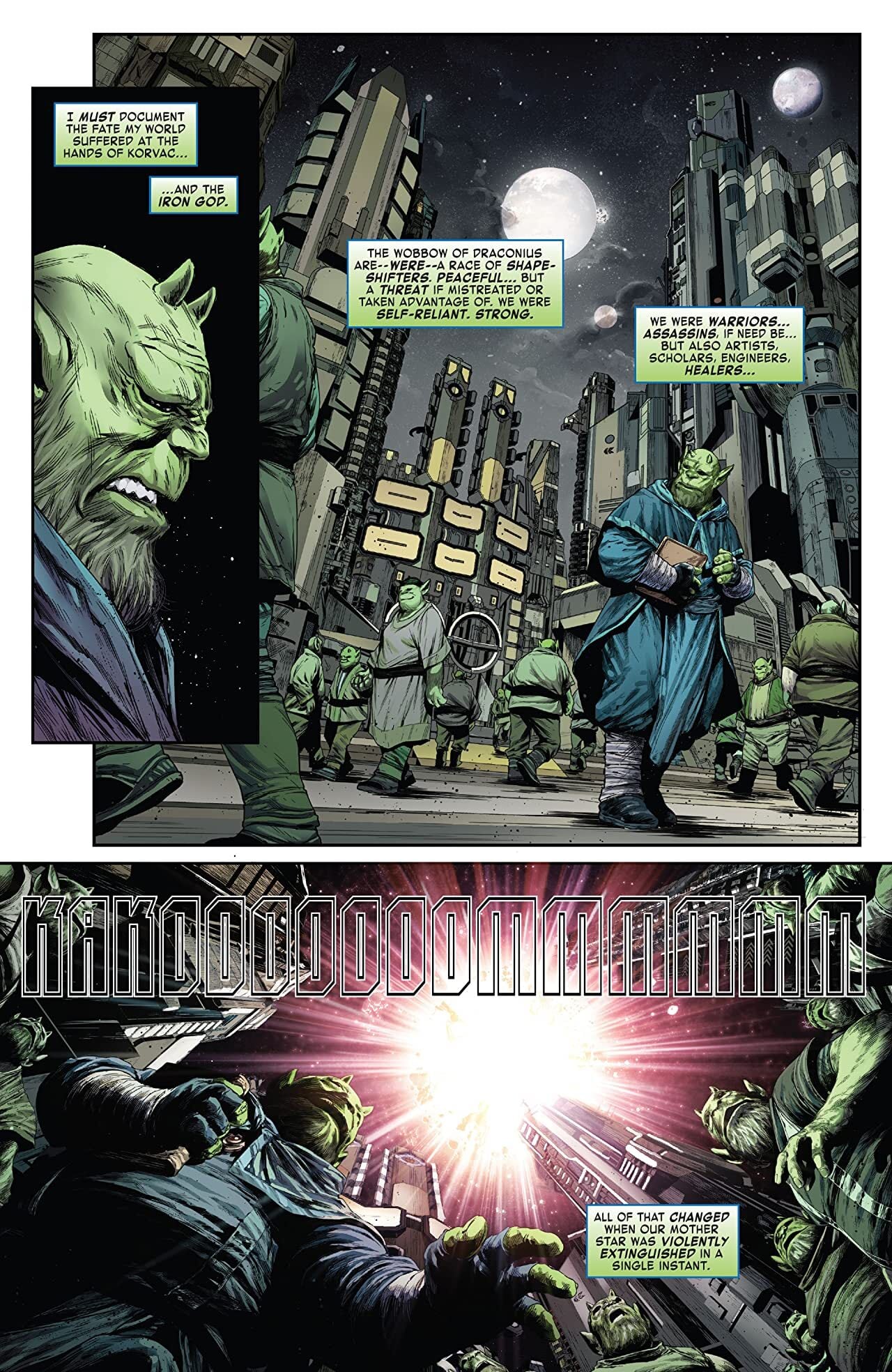 IRON MAN HAS BECOME THE IRON GOD! Only trouble is Korvac has once again become cosmic as well. Their conflict now spills out across the universe as both newly nigh-invincible entities vie for absolute dominance. What does it look like when two massive egos with celestial-sized abilities duke it out? What kind of havoc does it cause as they tear through galaxies and dimensions? And how can a handful of tiny humans stop them in hope of saving their old friend Tony Stark?